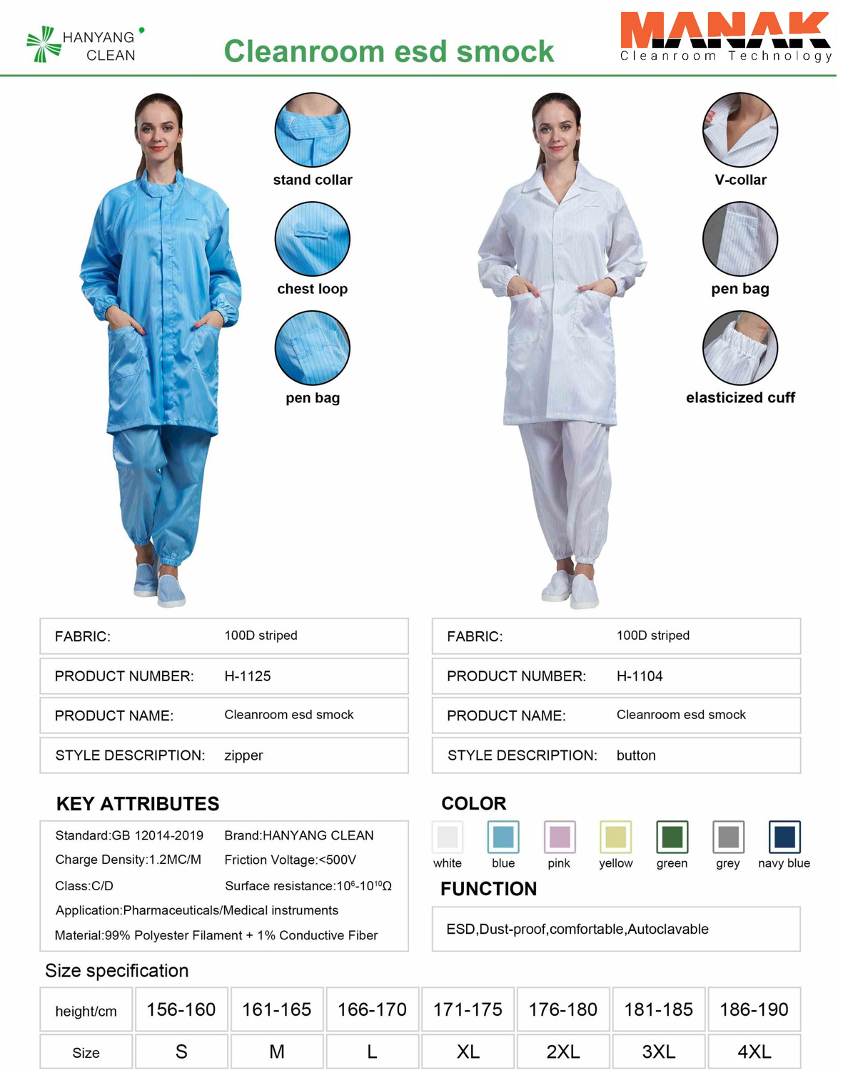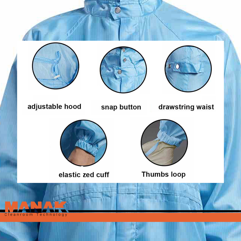 لباس اتاق تمیز آنتی استاتیک (Antistatic یا ESD Control) به عنوان پوششی در برابر انتشار ذرات در اتاق تمیز استفاده شده و از پرسنل در برابر خطرات احتمالی محافظت می کند. این لباس در دمای بالا با اسیدها، حلال های آلی و مواد شیمیایی هیچگونه واکنش و ترکیبی انجام نمی دهد و همچنین می تواند از آسیب دیدن قطعات حساس الکترونیکی در آزمایشگاه ها و انبار ها جلوگیری کند. این لباس علاوه بر جلوگیری از جرقه در محیطهای دارای حلالها و مواد آتش زا از جذب پارتیکل و میکروارگانیسم ها در اتاق تمیز نیز جلوگیری می کند.